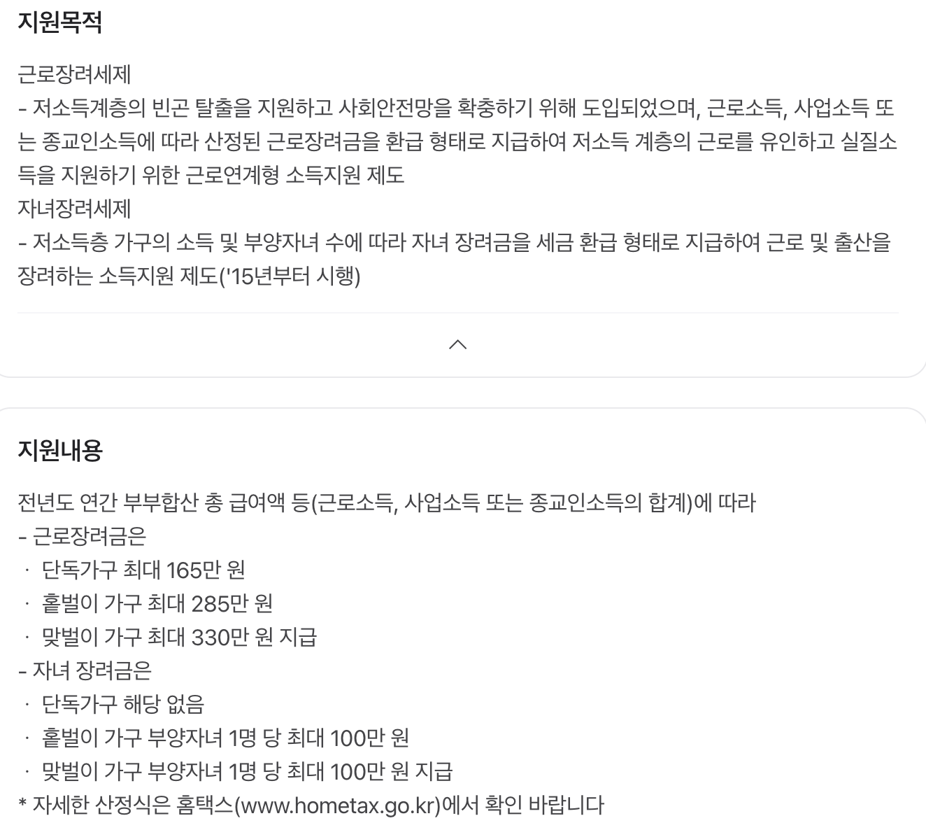 - 취지: 저소득 근로자 및 자영업자를 지원하여 근로 의욕을 높이고 소득을 보전하는 제도입니다.