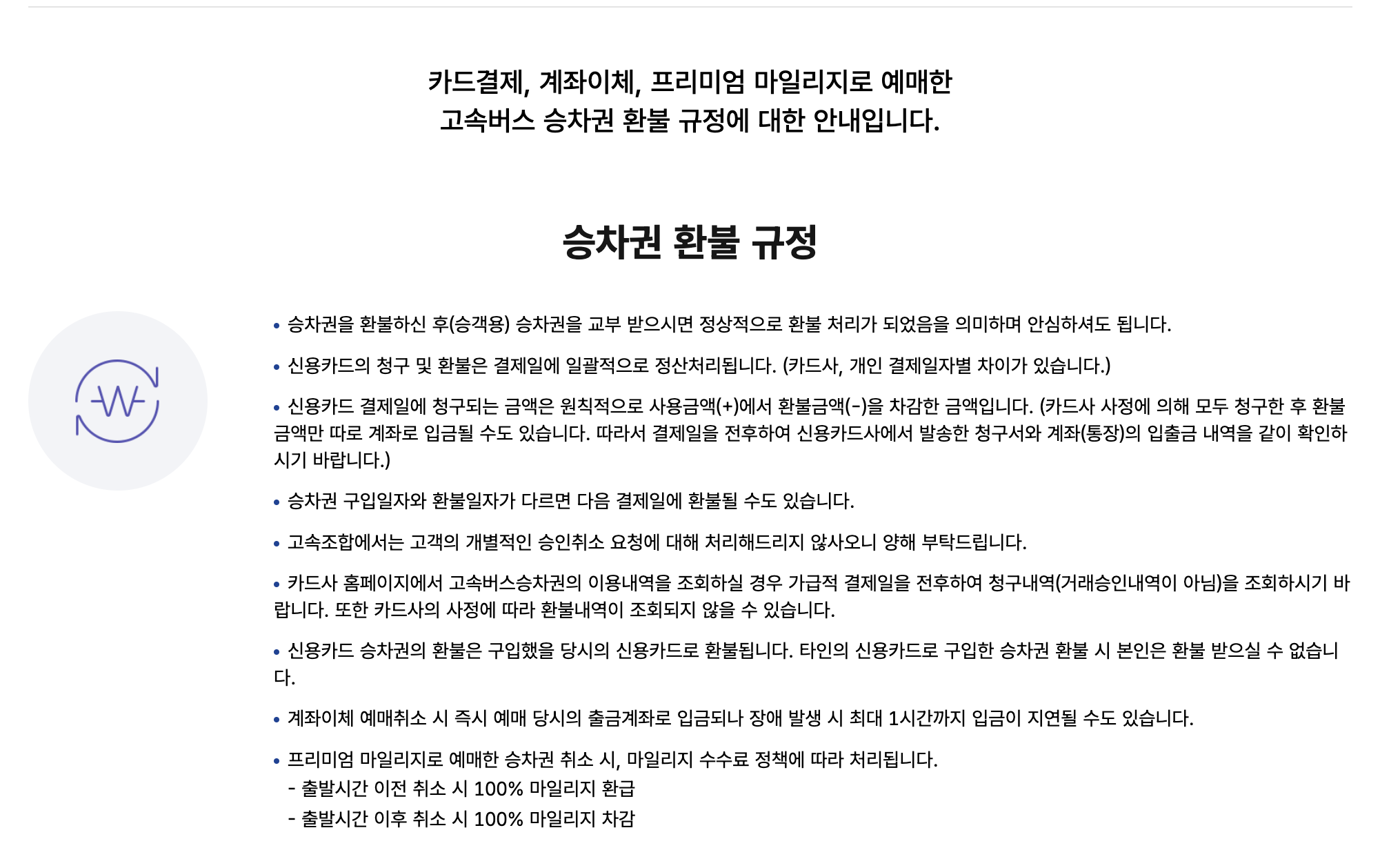 - 변경: 출발 시간, 노선, 좌석 등을 수정할 수 있습니다. 단, 일부 변경은 수수료가 발생할 수 있습니다.