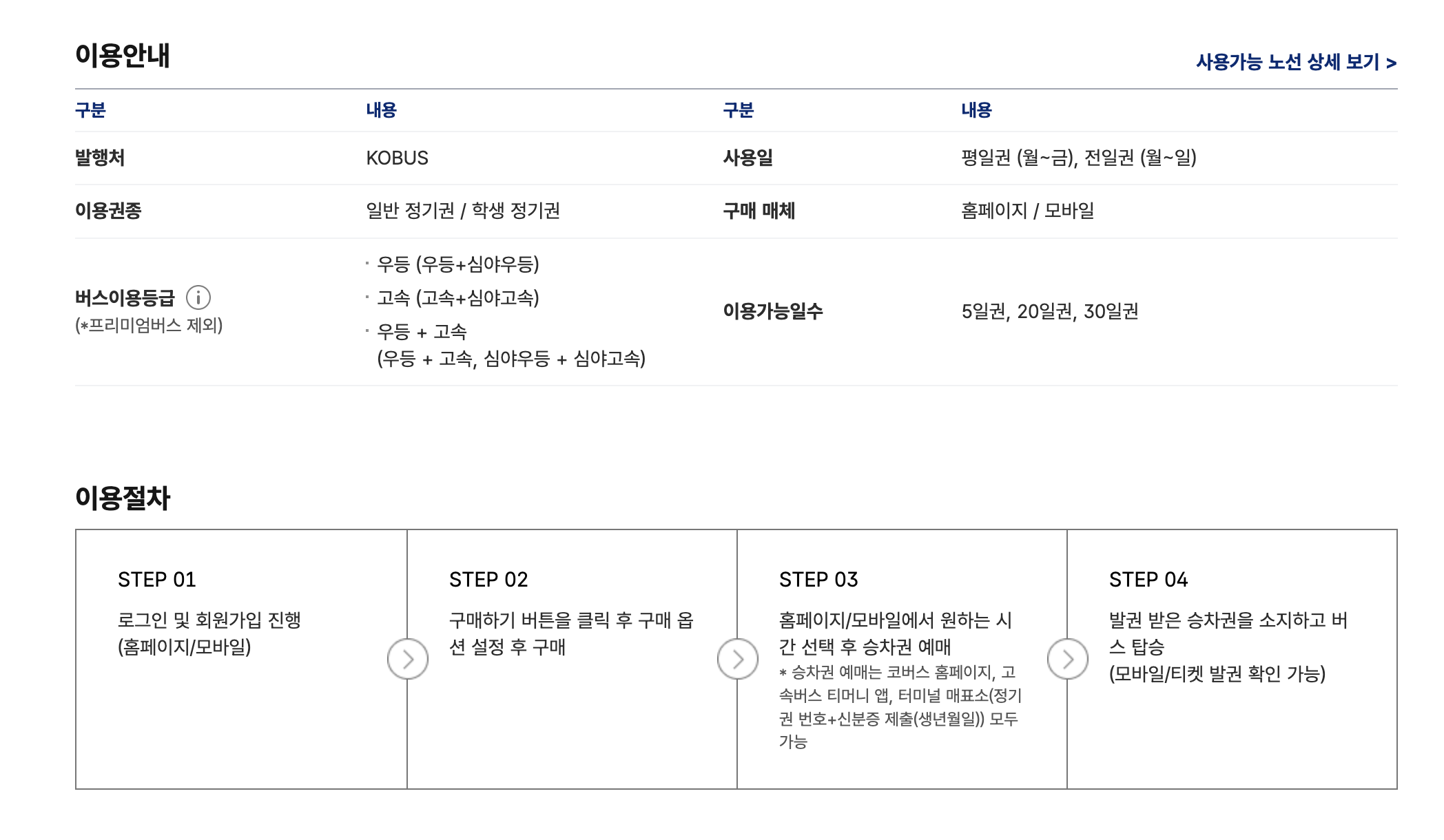 - 정기권 구매: 특정 노선에 대해 월간, 분기별, 연간 등 기간을 설정하여 정기권을 구매할 수 있습니다.